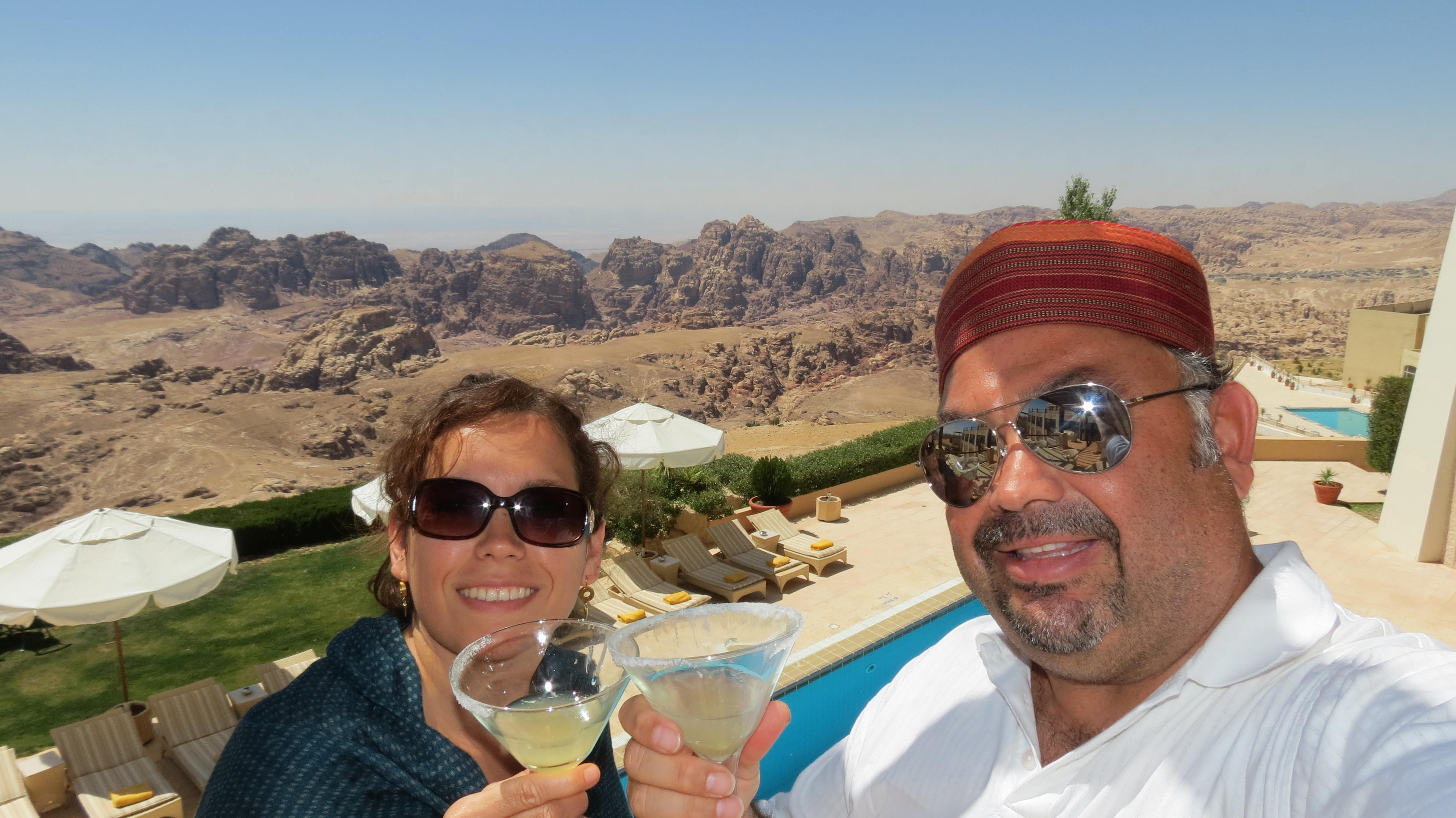 El hotel tiene vistas panorámicas extraordinarias de la ciudad, ademas de que la comida esta realmente deliciosa. Aquí brindando antes de partir a disfrutar de «Petra en la noche»